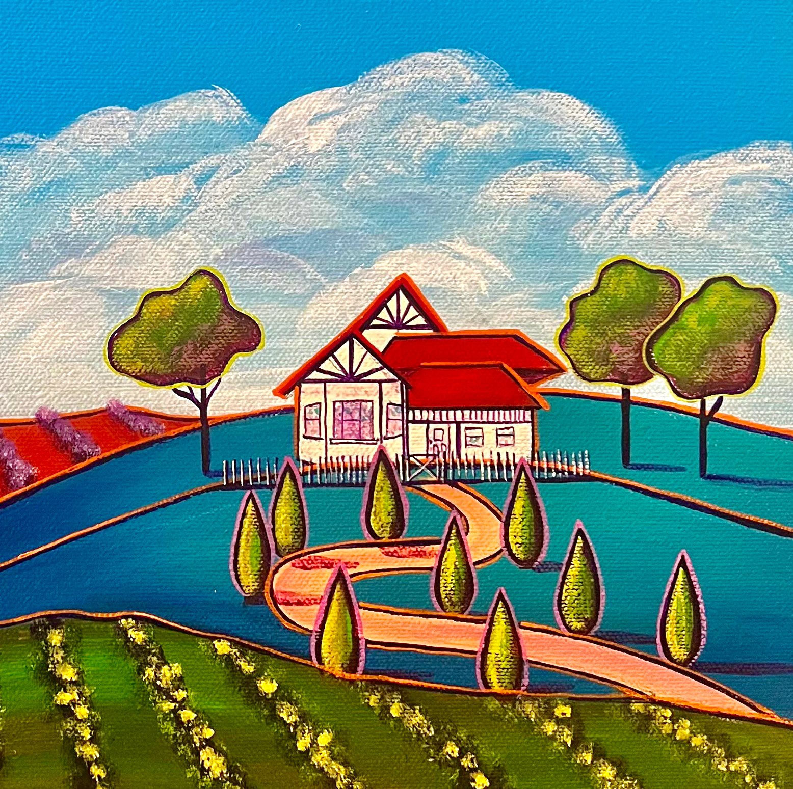 A picturesque house sits in the middle of fields on a bright sunny day, wispy clouds swirling on the horizon in the background.