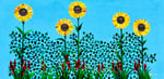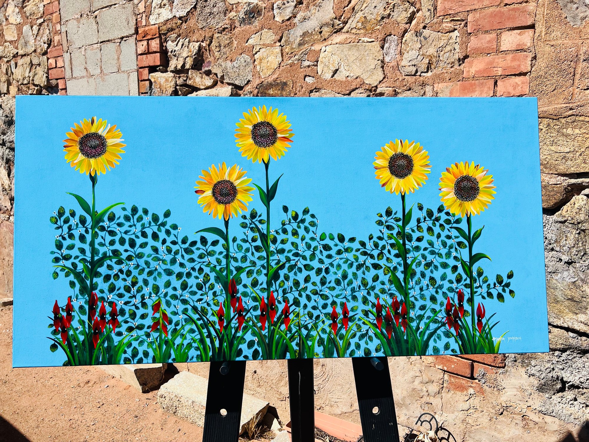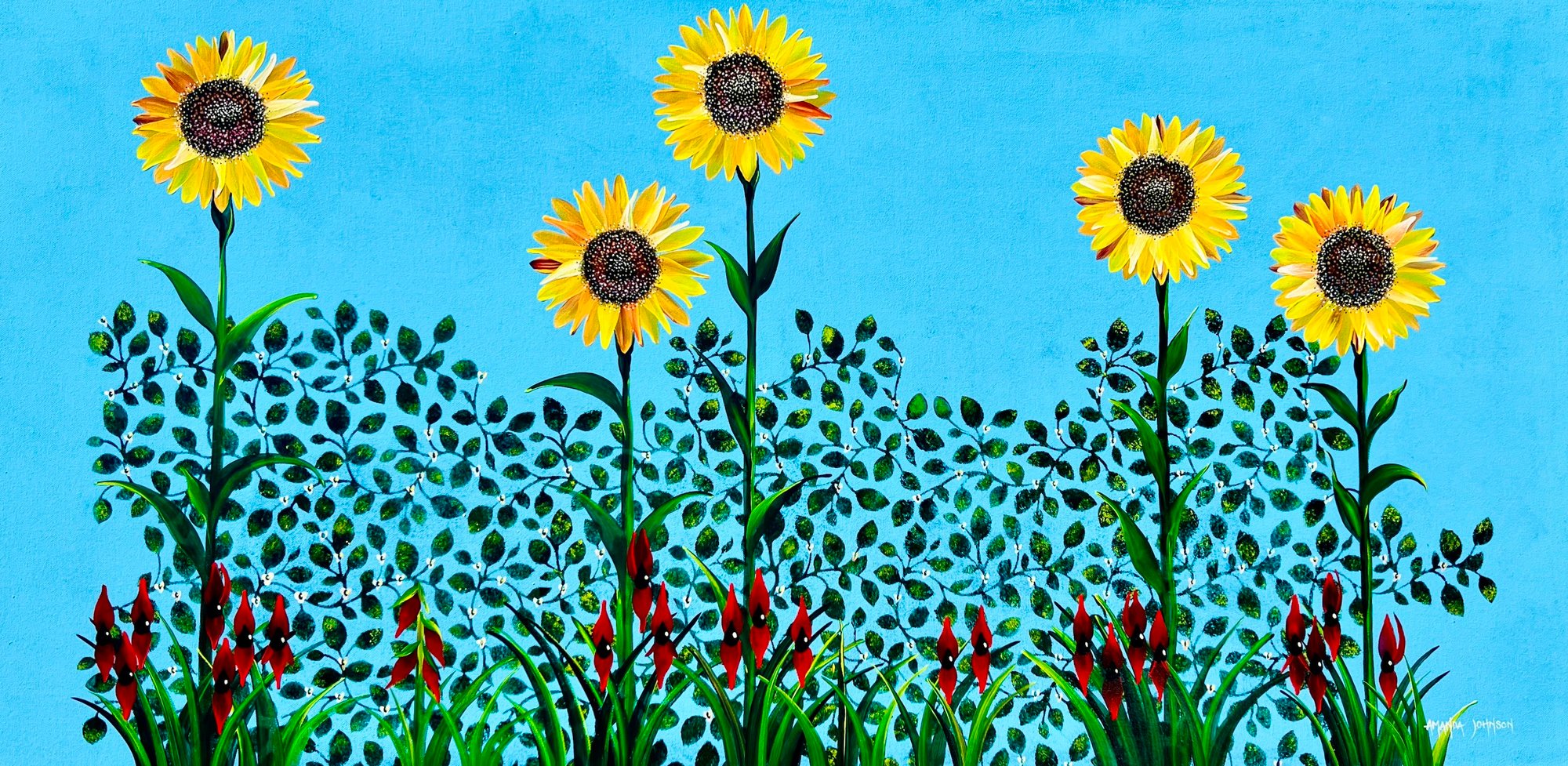 Beautiful Sunflowers on a bright sunny day with vibrant Sturt's Desert Peas for company